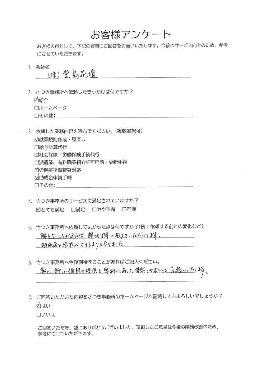 株式会社 堂島花壇 様 依頼した業務内容を選んでください 就業規則作成・見直し、社会保険・労働保険手続代行、労働基準監督署対応、助成金申請手続 LIAへ依頼してよかった点は何ですか? 解らないことがあれば、親切丁寧に教えていただいています。助成金の活用ができるようになりました。 LIAへ今後期待することがあればご記入ください 常に新しい情報の提供と弊社にあった提案とサポートをお願いいたします。 アンケートを見る