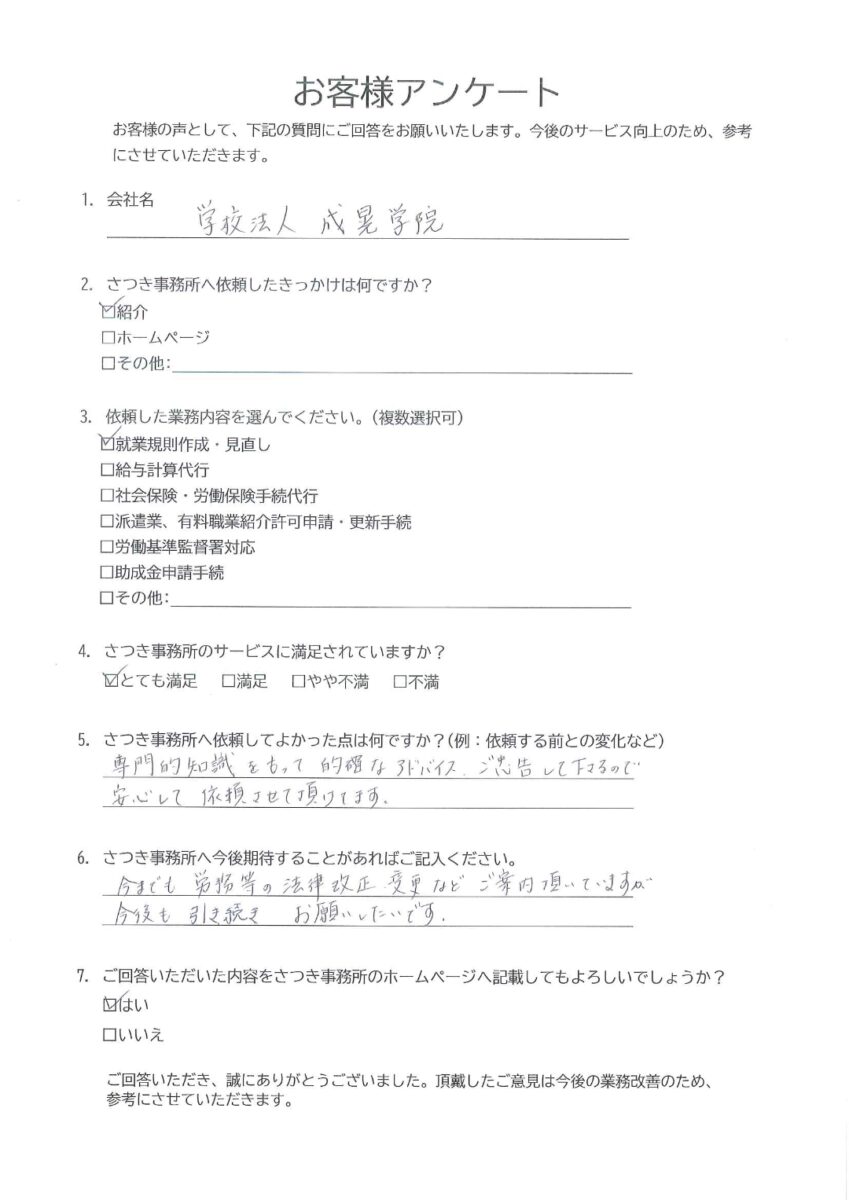 学校法人 成晃学院 様 依頼した業務内容を選んでください 就業規則作成・見直し LIAへ依頼してよかった点は何ですか? 専門的知識をもって的確なアドバイス、ご忠告をして下さるので安心して依頼させて頂けてます。 LIAへ今後期待することがあればご記入ください 今までも労務等の法律改正、変更などご案内いただいていますが、今後も引き続きお願いしたいです。 アンケートを見る