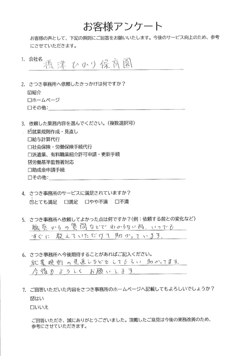 摂津ひかり保育園 様 依頼した業務内容を選んでください 就業規則作成・見直し、労働基準監督署対応 LIAへ依頼してよかった点は何ですか? 職員からの質問などでわからない時、いつでもすぐに教えていただけて助かっています。 LIAへ今後期待することがあればご記入ください 就業規則の見直しなどをしてもらい、助かっています。今後もよろしくお願いします。 アンケートを見る