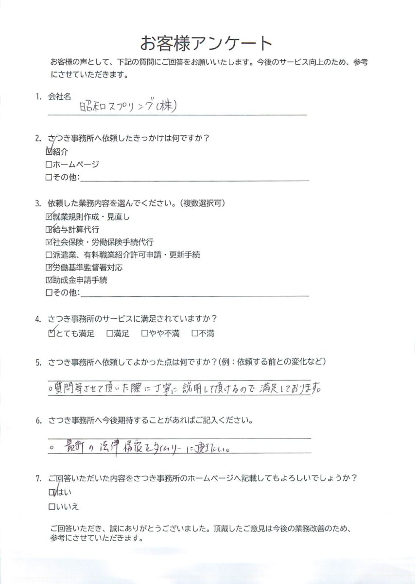 昭和スプリング 株式会社 様 依頼した業務内容を選んでください 就業規則作成・見直し、給与計算代行、社会保険・労働保険手続代行、労働基準監督署対応、助成金申請手続 LIAへ依頼してよかった点は何ですか? 質問させて頂いた際に丁寧に説明して頂けるので満足しております。 LIAへ今後期待することがあればご記入ください 最新の法律情報をタイムリーに頂きたい。 アンケートを見る