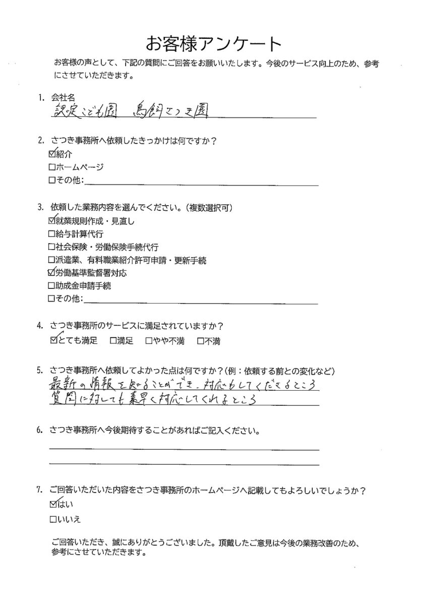 認定こども園 鳥飼さつき園 様 依頼した業務内容を選んでください 就業規則作成・見直し、労働基準監督署対応 LIAへ依頼してよかった点は何ですか? 最新の情報を知ることができ、対応もしてくださるところ。質問に対しても素早く対応してくれるところ。 アンケートを見る